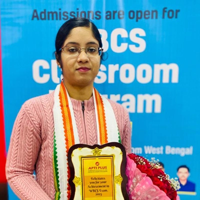 Hello, I am Manami Sarkar. I have been selected for West Bengal Revenue Service in WBCS (Exe.) Exam, 2023 and secured rank 32 in the Common Merit List. I was a student of Apti Plus Academy’s classroom programme in 2022. The institution’s constant support and guidance has played a crucial role in helping me achieve this feat. The encouragement and clarity of concepts provided by the expert faculties has shaped my knowledge and confidence. This success is as much theirs as mine. I am forever grateful to Apti Plus for helping me achieve my dream.