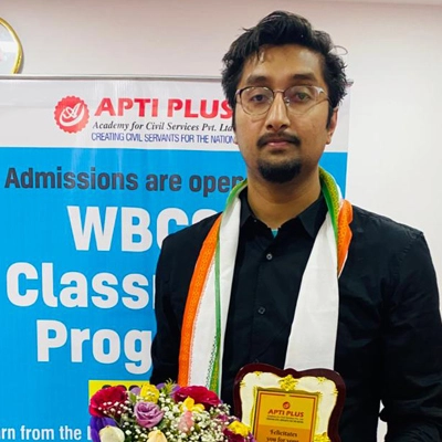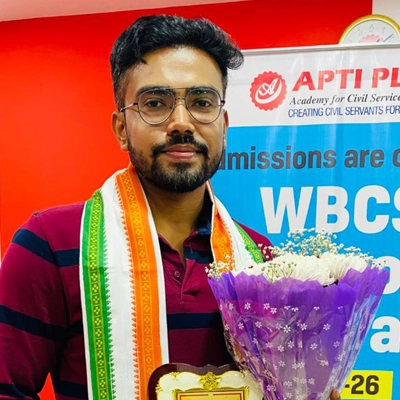Hello, I am Soumen Purkait. I have been selected as the Assistant Commissioner of Revenue in WBCS (Exe) Exam 2023 and secured rank 219 in the CML. I am a test-series student of Apti Plus Institution. I appeared here in 2022, 2023 and 2025. The institution’s constant support and guidance has played a crucial role in helping me achieve this feat. I am forever grateful to Apti Plus for helping me to achieve my dream.